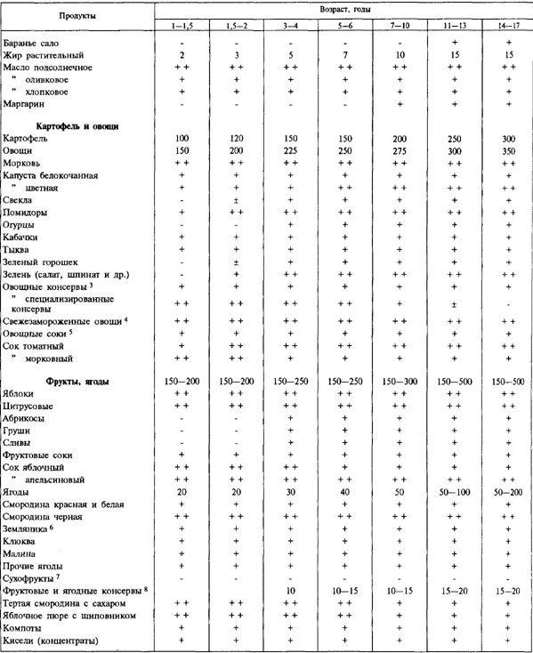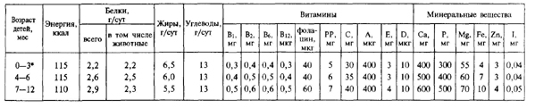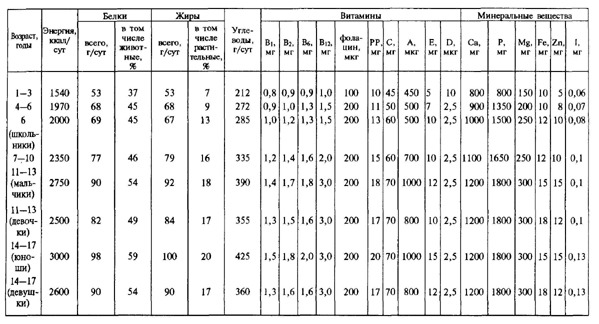 Правильная организация питания предусматривает поступление в организм необходимого количества продуктов определенного качественного состава. Это положение получило название концепции сбалансированного питания. Она предусматривает для каждого периода развития ребенка свою величину потребности в основных пищевых веществах и энергии с учетом физиологических особенностей организма и метаболических процессов, присущих ребенку данного возраста. Для детей характерна относительно высокая потребность во всех пищевых и биологических компонентах, что связано с интенсивным ростом, развитием и напряженностью обменных процессов, свойственных детскому организму. В настоящее время определены величины потребности в основных пищевых веществах и энергии для 7 возрастных групп детей. Группу детей в возрасте 14—17 лет делят еще и по полу, так как этот период имеет свои физиологические особенности, определяющие различную потребность в основных пищевых веществах. Дети в возрасте до 1 года выделены в особую группу в связи с тем, что интенсивность метаболических процессов на протяжении первого года жизни быстро меняется и это ведет к различной потребности в основных пищевых веществах в каждом квартале. Суточная потребность детей в энергии с возрастом меняется. Основное количество энергии человек получает из углеводов пищи. Дети первых месяцев жизни покрывают свои энергозатраты за счет углеводов и жиров молока. По мере роста детей основным источником энергии становятся углеводы. Белки служат пластическим материалом: входят в состав клеток, тканей, принимают активное участие в образовании ферментов, гормонов, антител, в кроветворении. При сгорании 1 г белка выделяется 4 ккал. Основное количество белка организм получает с пищей, и лишь незначительный процент его синтезируется за счет жиров и углеводов. Белки в основном содержатся в молоке, твороге, мясе, яйцах, рыбе, крупах и хлебе. Ценность белка прежде всего определяется составом входящих в него аминокислот: незаменимых и заменимых. Незаменимые (эссенциальные) аминокислоты жизненно необходимы организму, хотя в нем не образуются и поступают только с пищей. К незаменимым аминокислотам относятся триптофтан, фенилаланин, лизин, метионин, валин, лейцин, изолейцин, треонин и гистидин. Заменимые аминокислоты могут синтезироваться в организме, они дополняют действие незаменимых и тем самым повышают их ценность. Незаменимые аминокислоты в основном содержатся в продуктах животного происхождения, в связи с чем в суточных рационах предусмотрено не только общее количество белка, но и доля белка животного происхождения, которая составляет 70—75 % для детей раннего возраста, 60— 65 % для детей дошкольного возраста и не менее 50 % для школьников. Для ребенка раннего возраста очень ценны белки молочных продуктов, так как они легко перевариваются и ассимилируются в организме. С возрастом ребенка ассортимент продуктов, содержащих белки, постепенно расширяется. Жиры в основном обеспечивают энергетические траты и участвуют во многих жизненно важных функциях организма: входят в состав клеточных мембран, являются носителями жирорастворимых витаминов. Количество калорий, образующееся за счет жиров, должно составлять 40—50 % от суточной калорийности рациона детей раннего возраста и 30 % от рациона шко
