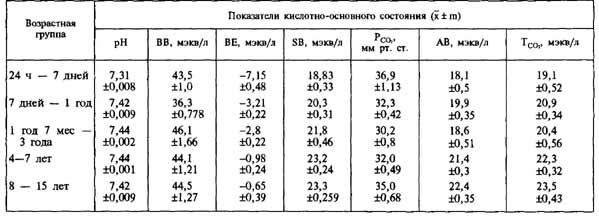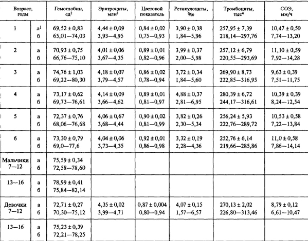 Таблица 16 Показатели кислотно-основного состояния крови здоровых детей (по Кузнецовой Т. Д.) Таблица 17 1 В строке «а» — величины М±га, в строке «б» — пределы колебаний, М±а. 2 В Международной системе единиц (СИ) г/л, коэффициент пересчета 1,666. Таблица 18 Возрастные особенности резистентности эритроцитов