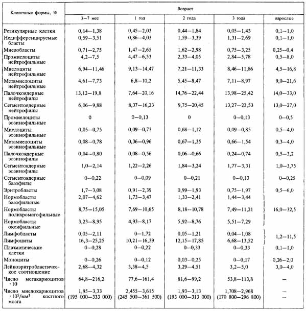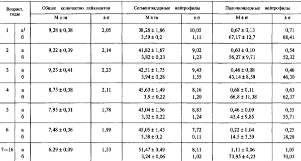 Таблица 19 Показатели белой крови здоровых детей 1 В строке «а» — относительные величины содержания форменных элементов, %\ в строке «б» — абсолютные (сегментоядерные нейтрофилы и лимфоциты, тыс); в Международной системе единиц (СИ) КР/л. Клетки крови