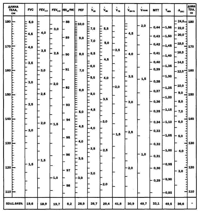 Таблица 30 Уровень гормонов в крови практически здоровых детей 11—15 лет (Кожевникова О. В., 1991) 1 В строке «а» пределы колебаний, в строке «6» — средняя величина. Номограмма для определения должных величин показателей кривой «поток—объем» у детей 6—16 лет Условные об озн а ч е н и я: FVC — форсированная жизненная емкость легких, л; FEV( 0 — объем форсированного выдоха за 1 с, л; FEV0 5 — объем форсированного выдоха за Vi секунды, л; FEV[ o/FVC —' коэффициент Тиффно, %; PEF.— пиковая скорость' выдоха, л/с V25 — скорость потока в точке 25 % FVC, л/с Vso — скорость потока в точке 50 % FVC, л/с Vys ~ скорость потока в точке 75 % FVC, л/с V25_75 — скорость потока в интервале 25—75 % FVC, л/с; V75-85 — скорость потока в интервале 75—85 % FVC, л/с; МТТ — среднее транзитное время выдоха FVC, с; TGES — общее время выдоха, с; А[ЕХ] — площадь кривой «поток—объем», л2/с Номограмма для определения должных величии легочных объемов Условные обозначения: ОЕЛ — общая емкость легких, л; ФОБ — функциональная остаточная емкость легких, л; ОО — остаточный объем, л. Номограмма для определения должных величин показателей функции внешнего дыхания у мальчиков 4—16 лет Условные обозначения: ЖЕЛ — жизненная емкость лепосс, л; МП — мертвое пространство, мл; ОФ1>1 — объем форсированного выдоха за 1 с, л; МВЛ — максимальная вентиляция легких, л; ИТ — индекс Тиффно, %; ДСЛ — диффузионная способность легких, мл (мин • мм рт. ст.)"1; ПС — пиковая скорость вдоха, выдоха, л/с. Номограмма для определения должных величин показателей функции внешнего дыхания у девочек 4—16 лет Условные обозначения: ЖЕЛ