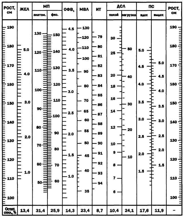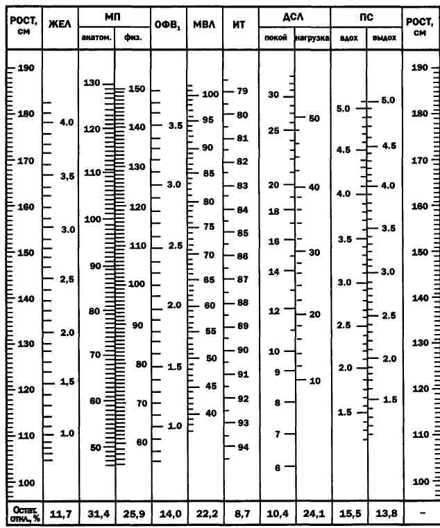 — жизненная емкость легких, л; МП — мертвое пространство, мл; ОФВ) — объем
