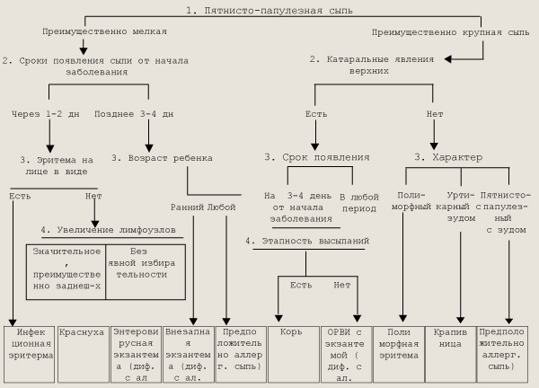 При дифференциальной диагностике заболеваний, сопровождающихся экзантемой, необходимо выявить и точно определить элементы сыпи при осмотре всех кожных покровов (при хорошем дневном освещении или освещении лампой дневного света). При клинической оценке сыпи следует учитывать не только ее характер и сроки появления, но и преимущественную локализацию, симметричность, наклонность сыпи к слиянию, количество, моно- или полиморфизм элементов, этапность высыпаний. Существенным компонентом характеристики сыпи является наличие или отсутствие свежих подсыпаний, зуда или других субъективных ощущений в местах высыпаний. Необходимо учитывать длительность и эволюцию высыпаний: при брюшном тифе и паратифах в отличие от других заболеваний розеолы сохраняются в течение 2—4 дн, а затем бесследно исчезают. В ряде случаев для ретроспективной диагностики инфекционных заболеваний у детей необходимо учитывать и вторичные элементы сыпи. Так, при кори после угасания первичных элементов сыпи наблюдается пигментация, а затем отрубевидное шелушение, при скарлатине пластинчатое шелушение кожи ладоней и стоп появляется на 2-й неделе заболевания, когда сыпь уже исчезла. Характер энантем также может иметь важное диагностическое значение. Так, мелкие очаги некроза на слизистой оболочке в области щек в виде пятнышек — пятна Вельского-Филатова- Коплика — характерны для кори. Мелкие кровоизлияния на переходной складке конъюнктивы (симптом Киари-Авцына) и у основания маленького язычка (энантема Розенберга) наблюдаются при сыпном тифе. Для скарлатины характерна отграниченная гиперемия в зеве, доходящая до твердого нёба. Везикулы на слизистых оболочках полости рта, губ, гениталий наблюдаются при ветряной оспе, простом и опоясывающем герпесе, ящуре; на миндалинах, слизистой оболочке задней стенки глотки, язычка, передних дужек — при энтеровирусной инфекции (герпанги-на). Афты — поверхностные язвочки, образующиеся из везикул и локализующиеся на слизистой оболочке полости рта, — чаще встречаются у маленьких детей и характерны для герпетической инфекции (афтозный стоматит). Семиотика экзантем при наиболее часто встречающихся инфекционных заболеваниях. В педиатрической практике часто встречаются макуло-папулезные сыпи, различающиеся по этиологии, — инфекционные и неинфекционные экзантемы. Инфекционные экзантемы встречаются при вирусных, бактериальных инфекциях, при протозойных инвазиях, гельминтозах. Корь — высококонтагиозная инфекция, протекающая с лихорадкой, симптомами интоксикации, катаром верхних дыхательных путей, с наличием характерной энантемы и этапным появлением с 3—5-го дня болезни пятнисто-папулезной сыпи на коже. В настоящее время корь относится к управляемым инфекциям, и заболеваемость зависит от качества проводимой вакцинации. Вирус кори обладает высокой летучестью, поэтому основной путь передачи при этом инфекционном заболевании -воздушно-капельный. Дети и взрослые, не имеющие антител в крови, восприимчивы к кори. В патогенезе кори решающее значение имеет тропизм вируса к эпителию верхних дыхательных путей, кожи, пищеварительной и нервной системам. Сыпь при кори появляется на 3—4-й день от начала заболевания, очень редко — на 2-й или 5-й день. Высыпает в течение 3—4 дн. Пато-гномоничным признаком для кори является наличи