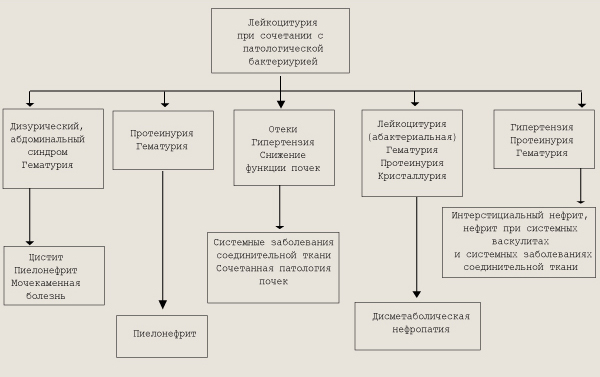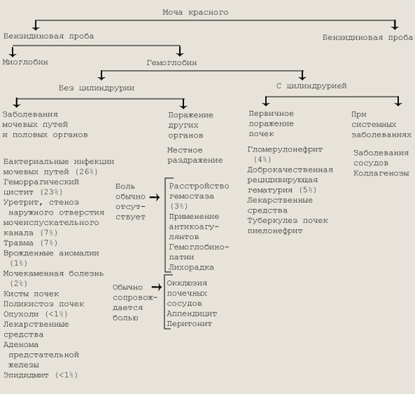 Дифференциальная диагностика при красном свете мочи Постреналъная гематурия связана со многими заболеваниями: острым и хроническим циститом, камнями мочевого пузыря, ангиомой, туберкулезной инфекцией, травмой, опухолями мочевого пузыря (у детей редко) и др. Для установления диагноза постренальной гематурии очень важны результаты цистоскопии. Цистит проявляется болями внизу живота, частыми и болезненными мочеиспусканиями, поллакиурией, иногда неудержанием мочи. Общее состояние обычно не страдает. В анализах мочи при цистите наряду с нейтрофильной лейкоцитурией и бактериурией, повышенным количеством плоского эпителия выявляется микрогематурия, которая носит терминальный характер, что обусловлено преимущественным поражением области треугольника Льето и шейки мочевого пузыря. Пр и мочекаменной болезни камни могут опуститься из почек или образоваться в самом мочевом пузыре. Характерны приступообразная боль, дизурия, гематурия, лейкоцитурия. Возможна острая задержка мочеиспускания при окклюзии камнем мочеиспускательного канала. Опухоли мочевого пузыря встречаются у детей редко. Проявляются расстройством мочеиспускания (учащенное, болезненное), а при поражении шейки мочевого пузыря — затруднением мочеиспускания вплоть до его задержки. Гематурия непостоянна, для нее характерны внезапное появление и прекращение боли. Травмы мочевы водящих органов — ушибы, размозжения, разрывы — сопровождаются развитием болевого шока, нарушением мочеиспускания, образованием мочевых затеков, урогематом, мочевых свищей, гематурией. Диагностика гематурии -основывается на учете анамнеза заболевания, возраста пациента, данных физикального обследования, лабораторных и инструментальных методов: состав мочевого осадка, трехстаканная проба, ортостатическая проба, фазовоконтрастная микроскопия мочи (морфология эритроцитов), УЗИ почек и мочевого пузыря, экскреторная урогра-фия (в том числе снимок в положении стоя), почечная ангиография, компьютерная томография, биопсия почки. При подозрении на почечный характер гематурии проводятся экскреторная урография, ультразвуковое исследование, цистоскопия, ангиография, а также биопсия почки. При подозрении на поражение мочевого пузыря наряду с бактериологическим (иногда и цитологическим) исследованием мочи проводятся экскреторная урография с нисходящей цистографией, цистоскопия. Следует помнить о возможности псевдогематурии, при которой красная окраска мочи может быть следствием применения медикаментов (рифампицина, нитрофуранов), употребления в пищу свеклы, присутствия в моче уратов. Красный цвет мочи может быть связан также с гемоглобинурией и миоглобинурией. СЕМИОТИКА ЛЕЙКОЦИТУРИИ. Признаком лейкоциту-рии считается наличие в анализе мочи более 6—8 лейкоцитов в поле зрения. Как правило, она сопровождается щелочной реакцией мочи. Однако при обычных анализах мочи не всегда можно выявить лейкоцитурию, поэтому в сомнительных случаях исследование проводится специальными методами, из которых наибольшее распространение получили пробы по Аддису-Каковскому и Нечипоренко. Для пробы по Аддису-Каковскому собирается суточная моча и определяется количество форменных элементов с учетом ее суточного объема. В норме количество лейкоцитов не превышает 2 млн., эритроцитов — 1 млн., цилиндр