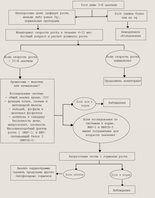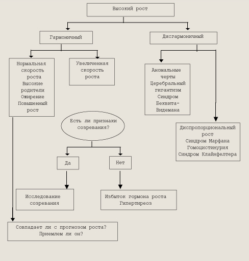 Алгоритм мониторинга детей при низкорослости СЕМИОТИКА ВЫСОКОГО РОСТА. Обычно чрезмерный рост у детей заставляет родителей обращаться за помощью в пучаях сопутствующих отклонений от нормы в виде утомляемости, частых заболеваний, нарушений полового развития и др. При их отсутствии ускоренный рост редко является причиной пя беспокойства. Чаще всего, если не считать генетически высоких людей, у детей наблюдается конституциональное ускорение роста. У таких детей ускоряются созревание костей, рост и рано наступает пубертатный период. Конституционально высокие люди пропорционально сложены, у них отсутствуют признаки повышенного внутричерепного давления. Ожирение в препубертатном возрасте может привести к ускоренному росту, однако это явление временное; дети могут эыть высокими, но не достигают гигантского роста. При открытых зонах роста избыток гормона роста у детей триводит к развитию гигантизма, а не акромегалии, как у взрослых, однако признаки акромегалии бывают и при гигантизме даже у детей и подростков, а после закрытия эпифизов акромегалия становится более выраженной. Избыточная продукция соматотропного гормона может привести к ускоренному росту ребенка при каких-либо процессах (гидроцефалия, перенесенный энцефалит), стимулирующих активность гипоталамо-гипофизарной области. В этом случае гигантизм может развиться в любом возрасте, но наиболее часто ускорение роста начинается в дошкольном или школьном возрасте. Для этих детей характерны легкая утомляемость, пониженная сопротивляемость к инфекциям, нескладность фигуры, слабое развитие мускулатуры, при внимательном осмотре можно обнаружить акромегалоидные черты. Гипофизарный гигантизм встречается редко. Его причиной чаще всего является эозинофильная аденома, описаны случаи гигантизма и при опухоли гипоталамуса. У двух мальчиков с синдромом Олбрайта и ускоренным ростом были обнаружены функционирующие опухоли гипофиза; уровень СТГ у них был значительно повышен и не снижался при нагрузке глюкозой. В ряде случаев гигантизм и акромегалия могут начинаться как гипоталамические нарушения, которые приводят к гипертрофии и гиперплазии, а в итоге и к опухолевидному разрастанию соматотропных клеток. Гамартомы гипоталамуса (ганглиоцитомы) способствуют развитию акромегалии, секретируя рилизинг-фактор гормона роста. Другие опухоли, особенно исходящие из поджелудочной железы, вызывают акромегалию, вырабатывая рилизинг-гормон. В большинстве случаев ускоренный рост становится очевидным в пубертатный период, но может проявиться уже в возрасте 5 лет. Конечный рост иногда достигает 250 см и более. Часто необычно высокими для своего возраста (младший детский и начальный школьный) бывают дети с преждевременным половым развитием, но они не становятся гигантами, так как у них рано закрываются зоны роста и рост прекращается. Высокорослых нелеченных больных тиреотоксикозом, гипогонадизмом или с синдромом Марфана (арахнодактилия) легко отличить по клиническим признакам этих заболеваний, а уровень соматотропного гормона у них нормальный. В основе развития синдрома Клаинфелтера лежит хромосомная аберрация с наличием лишней Х-хромосомы (47,XXY, 48,XXYY, 48,XXXY и др.). Больные мальчики высокого роста с непропорционально длинными конечностями, в детстве они отличаются хрупким тел