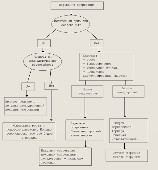 Задержка пубертата — отсутствие любых признаков полового созревания у подростка, достигшего верхнего возрастного предела нормального пубертата. Это означает отсутствие увеличения тестикулярного объема (<4мл) у мальчиков к 14 годам и отсутствие увеличения молочных желез у девочек к 13 годам. Полное обследование необходимо проводить девочкам при отсутствии развития грудных желез в возрасте 13 лет и отсутствии менструаций в возрасте 15 лет. Мальчиков нужно обследовать в тех случаях, если у них длина яичек не достигает 2,5 см в возрасте 15 лет. Причины задержки полового созревания у детей обоего пола можно разделить на три основные группы. Первая, наиболее частая, — временная функциональная, или конституциональная, задержка созревания гипоталамо-гипофизарной области. Вторая причина — органические поражения гипоталамо-гипофизарной области, приводящие к снижению секреции гонадотропинов (ги-погонадотропный гипогонадизм). Третья причина — первичная гонадная недостаточность, приводящая к растормаживанию гонадотропной секреции (гипергонадотропный гипогонадизм). Задержка полового развития конституционального характера — самая частая причина нарушений пубертата у детей, ее можно рассматривать как крайний вариант нормы. Однако функциональные нарушения созревания гипоталамо-гипофизарной области могут быть обусловлены влиянием неблагоприятных экзогенных факторов (хронические заболевания, стрессы, физические и эмоциональные перегрузки и т. д.). Имеются сообщения о влиянии на течение пубертата мутантных форм ЛГ, обладающих более коротким периодом жизни. В общей популяции гомозиготное носительство аномальных форм Л Г составляет 3 %, а гетерозиготное — 26 %. Наличие аномального Л Г приводит к задержанному течению полового созревания и в дальнейшем может приводить к нарушению репродуктивной функции. С жалобами на задержку пубертата чаще обращаются мальчики (9:1), хотя частота встречаемости этого состояния одинакова для обоих полов. Это связано с большей психологической дезадаптацией мальчиков. Главная причина, заставляющая страдать подростка, — это задержка роста, так как ростовой скачок у мальчиков значительно отдален по времени от первого появления вторичных половых признаков. Гипогонадотропный гипогонадизм может встречаться как изолированно, так и в сочетании с другими вариантами гипофизар-ной недостаточности или нарушениями формирования ткани мозга. Синдром Каллмена — врожденное заболевание с аутосомно-доминантным или Х-сцепленным аутосомно-рецессивным типом наследования с различной степенью экспрессивности, чаще встречается у мальчиков. Основной характеристикой синдрома помимо гипогонадизма является аносмия вследствие агенезии ольфакторных долей. Ольфакторные доли являются местом внутриутробной закладки нейронов, секретирующих люлиберин, которые затем мигрируют в область гипоталамуса. Таким образом, агенезия ольфакторных зон приводит не только к аносмии, но и к гипоталамической форме гипогонадизма. Пангипопитуитарная недостаточность, при которой дефицит гонадотропинов сочетается с выпадением секреции соматотропного гормона (СТГ), ТТГ, АКТГ, часто бывает обусловлена опухолями ЦНС, разрушающими ткань гипофиза. Краниофарингиома — самая частая причина, приводящая к снижению гипофизарной функции у де