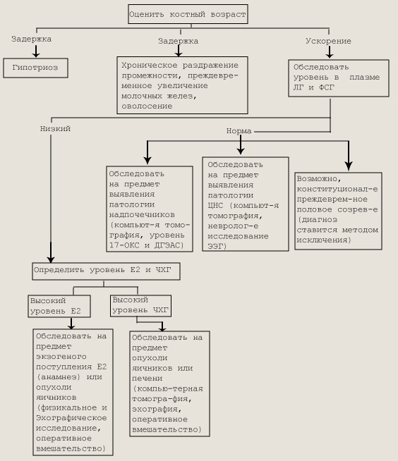 Девочки - Изосексуальное развитие (феминизация) Мальчики - Изосексуальное развитие (маскулинизация) - Гетеросексуальное развитие (феминизация) - Частичное преждевременное созревание Выделяются две основные формы преждевременного полового развития: истинное (гонадотропинзависимое) и ложное (гонадотропиннезависимое) вследствие повышенной секреции половых стероидов гормонопродуцирующими опухолями половых желез и надпочечников. Истинное преждевременное половое развитие вызвано повышением выброса гонадотропных гормонов гипофиза (ЛГ, ФСГ) в результате первичного поражения ЦНС и гипоталамической области. Часто эта форма сочетается с выраженной неврологической симптоматикой. При отсутствии причин, вызывающих преждевременное половое развитие, оно считается идиопатическим. У девочек ППР встречается значительно чаще, чем у мальчиков (4:1), причем преобладают спорадические формы. Половое развитие может завершаться быстро или медленно; процесс созревания может стабилизироваться или даже регрессировать, чтобы позднее начаться вновь. Развитие может начаться в любом возрасте. Первый признак у девочек — развитие молочных желез, возможно одновременное оволосение лобка, но чаще оно появляется позднее. Затем развиваются наружные половые органы, появляются волосы в подмышечных впадинах и начинаются менструации. Ранние менструальные циклы могут быть не столь регулярными, как при своевременном половом созревании. У мальчиков при ППР увеличиваются половой член и яички, появляются волосы на лобке, возникают частые эрекции. Голос становится более низким, ускоряется рост. Сперматогенез бывает уже в возрасте 5—6 лет, и возможны ночные поллюции. Как у мальчиков, так и у девочек ППР сопровождается приростом длины и массы тела. Дифференцировка костей скелета ускоряется и соответствует степени полового развития. Это приводит к раннему закрытию зон роста, в результате конечный рост оказывается ниже, чем он мог бы быть при своевременном половом развитии. Рост примерно у 1/3 больных не достигает 152 см. Развитие зубов и интеллекта соответствует хронологическому возрасту. Уровни ФСГ и ЛГ в плазме могут быть высокими по отношению к возрасту больного. Однако у 50% больных показатели в пределах нормы. Повышенные уровни гормонов могут чередоваться с нормальными. Уровни в плазме тестостерона (у мальчиков) и эстрадиола (у девочек) обычно повышены в соответствии со стадией пубертата и костного возраста. Экскреция 17-кетостероидов с мочой остается в пределах нормы или слегка увеличена. Возможны изменения на ЭЭГ, свидетельствующие о первичной патологии нервной системы. Причиной ППР могут быть самые разнообразные поражения ЦНС. Все они сопряжены с рубцеванием, инвазией или сдав-лением гипоталамической области. Чаще всего встречаются пи-неаломы, глиомы зрительных нервов, тератомы, располагающиеся над турецким седлом, нейрофибромы, астроцитомы и эпиндимомы. ППР сопровождаются и гипоталамические гамар-томы. Гамартома представляет собой доброкачественную эктопию ткани мозга, в 70% случаев она содержит нейросекре-торные гранулы люлебирина (ЛГ-рилизинг-гормон). Эктопия вызвана нарушением миграции секретирующих люлиберин нейронов в период эмбриогенеза, что приводит к их локализации вне гипоталамуса. Они могут функционировать автономно, сек-ретируя