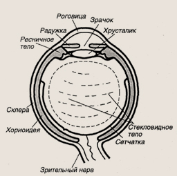 НА ПРИЕМЕ У ОФТАЛЬМОЛОГА Детский офтальмолог (от греч. «офтальмос» — глаз) занимается оценкой состояния органа зрения и его функций у детей. Чаще глазного врача называют окулистом — от латинского слова «окулюс». Многие дефекты органа зрения, беспокоящие взрослых, возникают еще в детстве, нередко причина заболеваний глаз обнаруживается в раннем возрасте, а иногда даже до рождения. Родители часто обращаются к врачу-офтальмологу, чтобы выяснить, все ли в порядке с глазами их ребенка, что могут означать те или иные признаки. Ряд подобных вопросов можно решить и самостоятельно, если знать основы строения и функции глаз ребенка, обращать внимание на необычные внешние признаки строения глаза, покраснение глаз, белый цвет области зрачка и пр. Но при заболеваниях глазного дна, травмах глаз необходимо обратиться к врачу. ОСНОВЫ СТРОЕНИЯ И ФУНКЦИИ ГЛАЗ Глаз по своей форме напоминает шарик для игры в настольный теннис. Снаружи видна лишь передняя часть глазного яблока. Это и прозрачный участок наружной (фиброзной) оболочки, называемой роговицей, и треугольные белого цвета участки непрозрачного отдела той же оболочки — склеры. Сквозь роговицу видна находящаяся глубже наружной сосудистая оболочка, точнее, ее красивая передняя часть — радужка, которая у каждого человека имеет индивидуальный рисунок и цвет. В центре радужки расположено круглое отверстие — зрачок. Задние отделы наружной и сосудистой оболочки не видны. Большую часть сосудистой оболочки, в глубине глазного яблока, выстилает внутренняя оболочка — сетчатка. Пространство между роговицей и радужкой (передняя камера) занято прозрачной водянистой влагой. За радужкой находится хрусталик — двояковыпуклая биологическая увеличительная линза, имеющая размеры горошины. Основной объем внутри глаза заполняет прозрачное бесцветное студнеобразное стекловидное тело. Глазное яблоко часто упрощенно сравнивают с фотоаппаратом. Подобно корпусу фотокамеры, склера придает ему форму и защищает то, что находится внутри этого хрупкого прибора. Роговица, как передняя линза в конденсоре объектива, собирает в пучок световые лучи, сосудистая оболочка выполняет роль диафрагмы Горизонтальное сечение глазного яблока и, подобно кассете, защищает от лишнего света «святое святых» глаза — сетчатку, которую можно сравнить с чрезвычайно чувствительной фотопленкой.