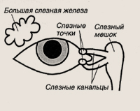 Дакриоцистит слева Обычно к моменту рождения преграда в этих путях рассасывается. Если же это не произошло, слеза не находит выхода и создаются условия для развития инфекции. Основной признак дакриоцистита — появление слезы или гноя из слезных точек при надавливании на область слезного мешка. Для обеззараживания слизистой в глазную щель закапывают противомикробные средства. При отсутствии результата от назначенного врачом ежедневного многократного массажа слезных путей, призванного вытолкнуть пробку, прибегают к хирургическим процедурам.