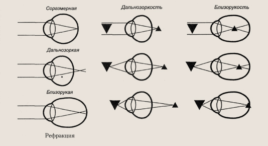 Ход лучей и видимость наблюдаемого объекта при различной его отдаленности от глаза Такое приспособление (фокусировка) глаза к видению на разном расстоянии называется аккомодацией. Если ребенок плохо видит далеко лежащие предметы, а при приставлении перед глазом минусовых стекол зрение его улучшается, он, вероятно, близорукий. Дальнозоркий же ребенок, благодаря напряжению своей аккомодации, со зрением вдаль справляется чаще. А вот долго рассматривая близкие предметы, он может быстро уставать, так как его аккомодации не хватает для сведения на сетчатке очень расходящихся лучей. Если при взгляде ребенка вдаль приставление к глазу выпуклого стекла не ухудшает его зрение, не создает этим искусственно близорукость, то вероятно, ребенок дальнозоркий. Помимо таких простых, но субъективных методов, зависящих от ответов исследуемого, существуют и объективные способы определения рефракции, которые может применить только врач. Правильно определить рефракцию и ответить на вопрос о том, нужны ли ребенку очки, может лишь врач-офтальмолог. Близорукость Близорукость не одинакова по времени наступления, степени усиления рефракции, осложнениям и прогнозу для зрения. Врачи различают три вида близорукости: обычную школьную миопию, врожденную миопию, миопическую болезнь. Большинство детей страдает школьной близорукостью, которая обычно начинается в тот период, когда ребенок еще находится в младших классах школы. Усиливается она медленно и редко достигает высоких степеней к взрослому возрасту. Анатомические нарушения глаза при школьной миопии либо отсутствуют, либо весьма незначительны. Что же рекомендуется для предупреждения школьной близорукости? • Читать ребенку следует с расстояния около 40 см, спина при чтении должна быть выпрямлена. Надо категорически запретить ребенку читать в транспорте. Близоруким детям иногда назначают лекарства, которые, по мнению ряда врачей, призваны улучшить питание глаза и укрепить его оболочки и сосуды. Однако и без активного вмешательства у большинства детей прогрессирование школьной близорукости замедляется само и к взрослому возрасту далее останавливается. Поэтому при сегодняшнем уровне возможностей медицинской науки и практики к любому очень активному вмешательству (особенно хирургическому) с целью вернуть высокое зрение при школьной близорукости надо относиться очень осторожно. Иногда близорукость возникает с рождения. Это так называемая врожденная миопия. У таких детей степень близорукости высокая и обычно имеются выраженные анатомические изменения глаза. Заболевание диагностируется к возрасту одного-трех лет. Оно редко прогрессирует, то есть степень такой близорукости Аккомодация редко увеличивается с возрастом.