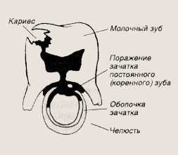 Кариес Кариес — это не всегда глубокая черная дырка в зубе. Различают: • кариес в стадии белого шероховатого пятна — когда разрушены только наружные кристаллы эмали; По тому, в каком месте зуба развивается кариес, выделяют кариес эмали, дентина и даже кариес корня. Если у вас есть зубы, на которых был кариес, а теперь стоят пломбы, их все равно надо осматривать 2-3 раза в год, потому что могут появиться новые дырочки. А для того чтобы их не было, надо проводить профилактику. Кариес временных зубов Кариес временных зубов у детей до трех лет, как правило, развивается на истонченной, неправильно сформированной, шероховатой эмали центральных резцов, чаще на верхней челюсти, чем нижней, и на первых премолярах (четвертый зуб от центра). Предрасполагающими факторами являются болезни матери в период беременности и патологические роды. Провоцирующим фактором становится искусственное вскармливание ребенка сладкими молочными смесями, кефиром, киселем, соками, чаем и морсами. Кариес временных зубов, спровоцированный частым сладким питьем в ночное время, получил название «кариеса молочной бутылочки». Он развивается быстро, безболезненно и поэтому обнаруживается неожиданно для родителей. Зубы бывают покрыты большим количеством налета с множеством микробов, иногда он имеет желтоватый цвет, под ним идет быстрое разрушение эмали и дентина. Во временных зубах кариес распространяется больше вширь, чем вглубь. Иногда в течение нескольких недель разрушение зубов достигает такой степени, что коронки центральных резцов обламываются даже при слабых жевательных нагрузках или небольшой травме. Дети жалуются на боль только при осложнениях кариеса, то есть тогда, когда дело доходит до воспаления сосудисто-нервного пучка (пульпит) и тканей, окружающих корень (периодонтит). Лечение таких зубов — очень сложная задача. В большинстве случаев при осложненном кариесе передние зубы у маленьких детей удаляют. Место дефекта желательно заместить искусственными зубами на пластинке, которая крепится кольцами-держателями за временные моляры. У детей от 3 до 6 лет кариес временных зубов чаще локализуется на боковых поверхностях зубов, так как в межзубных промежутках часто скапливаются остатки пищи. Если на боковой поверхности одного зуба появляется кариозная полость, то через некоторое время и на соседнем зубе возникает кариес и образуется контактная полость. Контактный кариес чаще формируется между временными пре-молярами. У часто болеющих детей могут быть поражены все временные зубы. Часто у таких детей выявляется повышенное потребление сладостей и недостаток кальция в организме. Чем больше у детей временных зубов, пораженных кариесом, тем выше риск развития кариеса постоянных зубов. Поэтому у детей испорченные временные зубы должны быть либо вылечены, либо удалены. Кариес постоянных зубов При кариесе постоянных зубов у школьников 6-7 лет кариесом в первую очередь поражаются первые моляры, или шестые зубы, как их называют врачи. При этом кариозные полости возникают на жевательных поверхностях зубов, в их естественных углублениях — фиссурах. Часто имеется точечное входное отверстие, которое ведет в большую кариозную полость, заполненную размягченным дентином. У детей среднего школьного возраста наиболее часто кариесом поражаются боковые поверхно