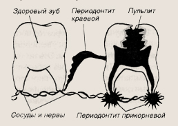 Пульпит и периодонтит Острый периодонтит встречается реже, чем хронический. Он сопровождается сильными болями при накусывании, затем могут появиться постоянные ноющие боли. При остром периодонтите не бывает патологических изменений на рентгеновском снимке. Это позволяет врачу отличить острый периодонтит от обострения хронического, при котором обязательно будут рентгенологические признаки длительно текущего околокорневого воспаления. При острых и обострившихся периодонтитах, кроме покраснения и отека слизистой оболочки, около больного зуба может развиться отек тканей щеки и подглазничной области. При этом отмечается увеличение близлежащих лимфатических узлов. В таких случаях временные зубы удаляют. Вообще-то удаление зубов при периодонтитах проводится только тогда, когда зуб сохранить невозможно. Это случается, когда ребенок не дает лечить зубы, когда зуб сильно разрушен, или имеется глубокий кариес корня, или разрушается дентин между корнями, а может быть, началось рассасывание корней. Лечение периодонтита постоянного зуба проводится врачом за несколько посещений, после обязательного в таком случае рентгенологического обследования. При лечении зубов по поводу периодонтитов стоматолог решает несколько задач. Основная цель лечения — ликвидация очага воспаления у корня и хорошее пломбирование корневого канала после его тщательной очистки специально предназначенными для этой цели инструментами. Если при пробном пломбировании возникают болевые ощущения, то корневые каналы неоднократно промывают противомикроб-ными растворами, а также при необходимости используют физиотерапию — внут-риканальный электрофорез йодистого калия или сложной медикальциевой соли. Это позволяет снять воспаление и запломбировать каналы зубов. Для контроля качества пломбирования каналов делают повторные рентгеновские снимки. При лечении периодонтитов в постоянных зубах с сформированными корнями у детей дошкольного и младшего школьного возраста для пломбировки каналов используют временные кальцийсодержащие пасты, которые уничтожают микроорганизмы корневого канала и стимулируют дальнейшее нормальное формирование корней, длящееся от 6 месяцев до года. В течение этого времени врач контролирует рост корней рентгенологическим методом. После формирования верхушки корня канал зуба пломбируют постоянными пломбировочными материалами. В тех случаях, когда через год после лечения очаг воспаления в области верхушки корня сохраняется или увеличивается, хирург-стоматолог делает операцию — резекцию верхушки корня. Эта небольшая операция осуществляется под местной анестезией. При этом через небольшой разрез хирург убирает костные ткани над корнем, затем отрезает верхушку корня и в области верхушки выскабливает измененные ткани. В области удаленной верхушки и резецированной кости через некоторое время появляется новая здоровая костная ткань. Таким образом околокорневой очаг инфекции полностью ликвидируется. Травма зуба Травмы зубов у детей — явление достаточно частое, и, по понятным причинам, с мальчиками такое приключается чаще. Это бывает при спортивных играх, катании с горки, случайных падениях и т. д. Зуб можно ударить, вывихнуть и сломать. При травмах зубов и челюстей надо обязательно обратиться к стоматологу. При вкол