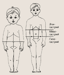 Возможная локализация болей в животе В брюшной полости все отделы желудочно-кишечного тракта имеют свое место, их локализация определяет и проекцию болей на переднюю брюшную стенку. По возможности у ребенка необходимо выяснить, в каком месте болит живот, где боль начиналась, куда перешла и т. д. Дети до трех лет не могут точно локализовать боль и, «как партизаны», на вопрос: «где болит?» неизменно кладут ладошку на область пупка. Это объясняется тем, что именно в проекции пупка находится солнечное сплетение — скопление нервных клеток, расположенное на брюшной аорте, где собирается вся информация о болях, возникающих в животе у ребенка. Когда малыш становится постарше, он уже способен не только охарактеризовать имеющиеся у него боли, но и указать место их наибольшей выраженности. Это очень помогает врачу в постановке правильного диагноза. Для уточнения локализации наибольшей выраженности болей следует знать некоторые «географические ориентиры» на передней брюшной стенке. Так, если через пупок мысленно провести две взаимно перпендикулярные линии, образующие крест, то передняя брюшная стенка будет разделена на четыре квадрата, называемые квадрантами: правый и левый верхние и правый и левый нижние квадранты живота. Если же мысленно нарисовать на передней брюшной стенке две горизонтальные линии по нижним краям реберных дуг и по наиболее выступающим участкам подвздошных костей таза, то передняя брюшная стенка разделится на верхнюю часть — эпигастрий, среднюю часть — мезогастрий и нижнюю часть — гипогастрий. Если провести две вертикальные линии от середины реберных дуг к боковым частям лобка, то передняя брюшная стенка поделится на девять областей: правое и левое подреберье, собственно эпигастрий, правую и левую боковые области живота - фланки, пупочную область, правую и левую подвздошные или паховые области и надлобковую область. Такая «география» позволяет достаточно.точно определить источник болей. Так, боли, связанные с желудком, будут локализоваться в эпигастрий, если причина болей кроется в поджелудочной железе, боли возникают в левом верхнем квадранте живота, при этом могут отдавать, иррадиировать в левую область поясницы. При дискинезиях и воспалении желчного пузыря, так же как и при дуодените, боли появляются в правом верхнем квадранте живота. Если источником боли является тонкая кишка, боли локализуются в околопупочной области. Для аппендицита при типичном расположении червеобразного отростка характерно возникновение болей в правой паховой области. Однако в редких случаях аппендикс может располагаться не типично, например высоко, под печенью, тогда при его воспалении боли могут появиться в области правого подреберья. При низком расположении воспаленного червеобразного отростка, в области малого таза, боль отдает в промежность и крестцовую область. В паховых областях боль локализуется и при гинекологической патологии у девочек. В надлобковой области болями проявляет себя воспаление мочевого пузыря. Боли в левом паху характерны для запоров, при которых здесь можно прощупать увеличенную переполненную содержимым сигмовидную кишку. В этой же области болями проявляет себя одна из наиболее частых инфекций — дизентерия, сопровождающаяся частым жидким стулом со слизью и зеленью, нередко с частыми мучител
